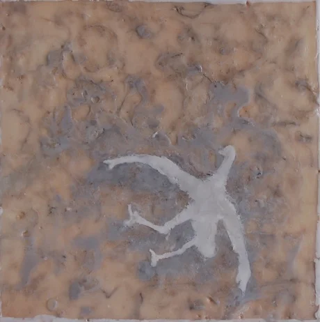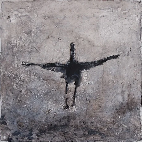 Encaustic is a method originally discovered by the ancient Greeks where oil pigment is mixed with melted beeswax then fused with a hot torch one layer at a time. It can be applied to any porous surface, and any organic collage material encased within the beeswax is rendered completely archival. As a painter I am fascinated by the wide range of atmospheric effects that are possible with encaustic. I used fabric, gold and silver leaf, dried grasses, and paper to tell the story of the crane’s survival, and to describe the ethereal elegance of this tall gray bird. They are all painted on 1/2” wood sign board measuring 8”x 8” and float 3/4” when hung on a wall.